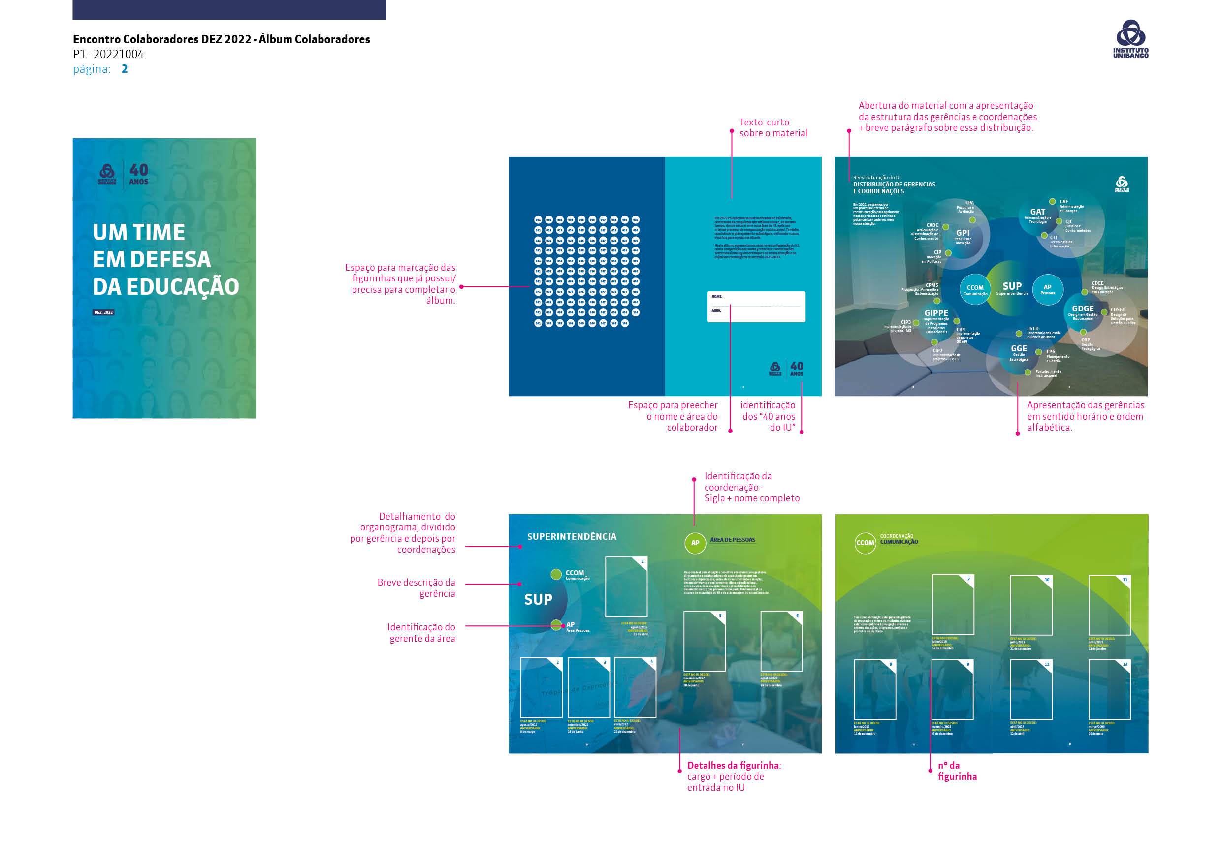 O projeto gráfico do álbum foi desenvolvido para equilibrar diversão e institucionalidade, dialogando com o universo lúdico das figurinhas sem perder o alinhamento com os valores e a identidade visual do Instituto Unibanco. O resultado é um material que vai além do objeto colecionável, funcionando como um registro simbólico das pessoas e das relações que fazem o Instituto existir.
